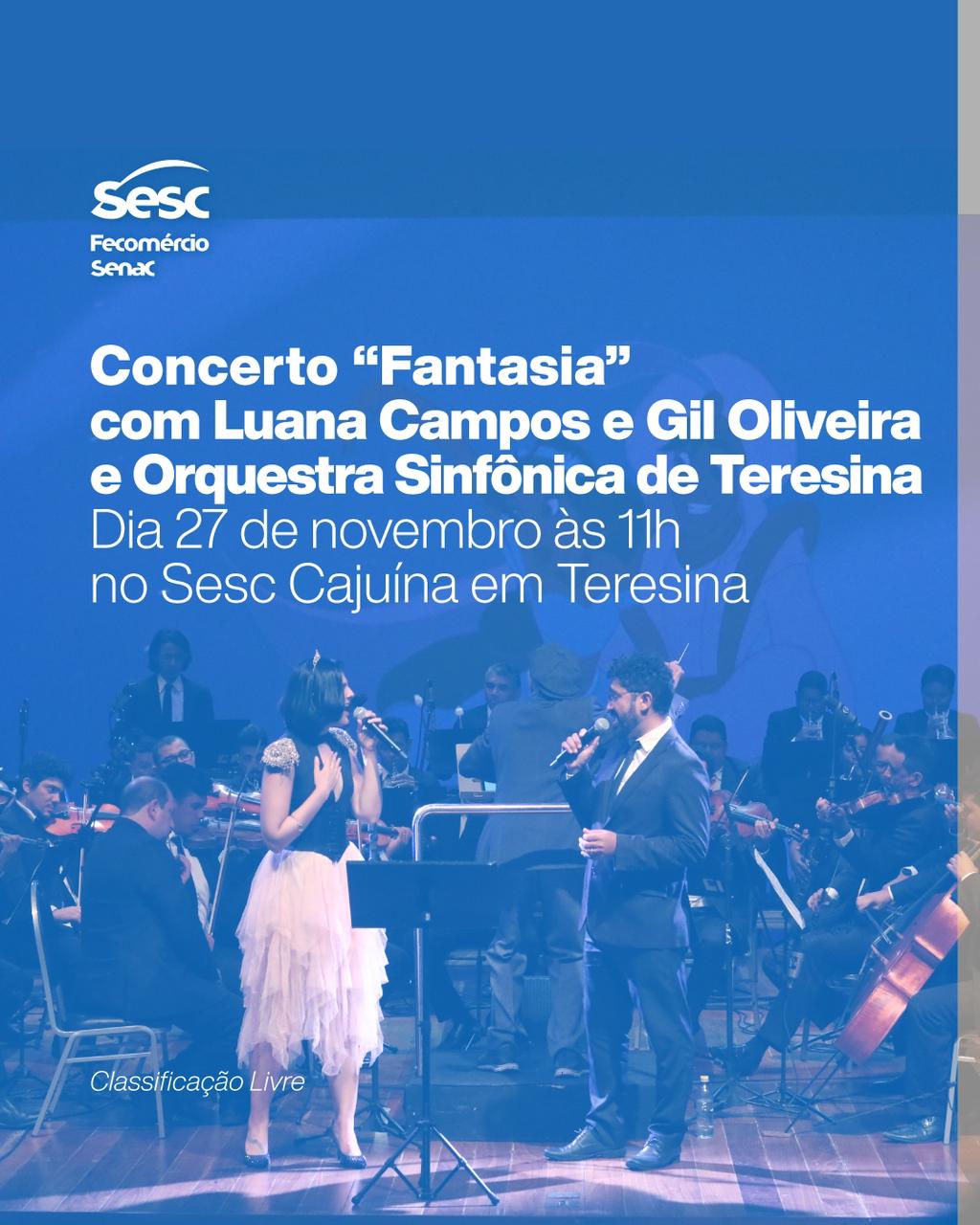 O Projeto Concertos Matinais apresenta o espetáculo Fantasia: Especiais da Disney, no próximo domingo (27), às 11h, no Sesc Cajuína. O concerto é uma parceria da Orquestra Sinfônica de Teresina (OST) com participação especial dos cantores Luana Campos e Gil Oliveira e reúne as canções mais famosas dos desenhos da Disney. Os ingressos estão disponíveis na sede do Sesc Cajuína, localizado na Av. Cajuína, 725 – Noivos, zona leste da capital.