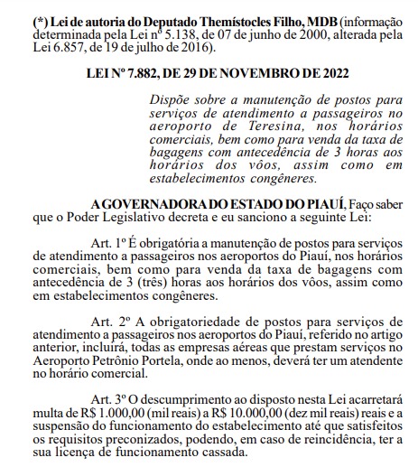 A Lei nº7.882 de 2022, que obriga o atendimento presencial por parte da companhias que atuam no Aeroporto Petrônio Portela, de autoria do deputado Henrique Pires, foi publicada no Diário Oficial do Estado do Piauí e as companhias têm o prazo de 180 dias para se adequar a nova legislação.