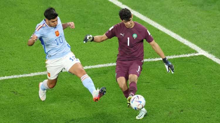 Nos poucos momentos em que Marrocos tinha a bola nos pés, a ousadia do goleiro Bounou quase colocou tudo a perder. Sem medo do perigo, ele ignorou a pressão do ataque espanhol e saiu jogando de forma arriscada algumas vezes. Em uma delas, aos 25min, a Espanha mordeu na saída e por pouco não abriu o placar, com Gavi acertando o travessão e Torres acertando a zaga no rebote. Para alívio de Marrocos, o assistente já assinalava impedimento.