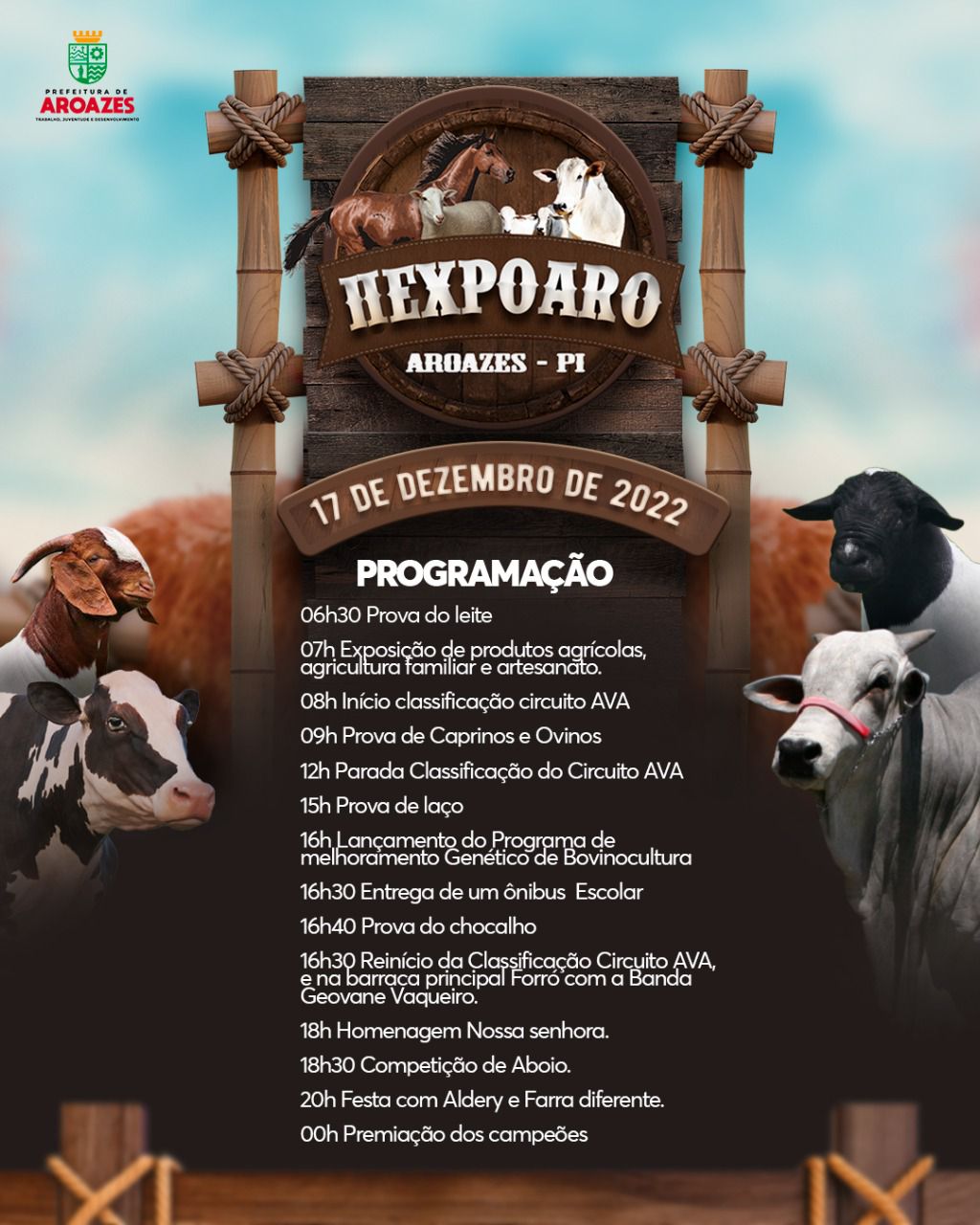 Dando continuidade a Programação da II Expoaro, será lançado às 16:00 h, o Melhoramento Genético de Bovinocultura, às 16:30 h ocorrerá a Entrega de um ônibus Escolar no município de Aroazes para atender a comunidade, às 16:40 será a Prova do Chocalho. Em seguida vai acontecer o reinício da classificação Circuito AVA e na Barraca Principal da II Expoaro, teremos Forró com a Banda Geovane Vaqueiro.