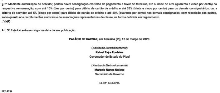 O governador Rafael Fonteles sancionou a Lei Complementar n 275, que altera o artigo 42 da Lei Complementar n 13/94 e dispõe sobre consignação em folha de pagamento, aumentando a margem do crédito consignado para servidores públicos estaduais, para desconto diretamente no contracheque.