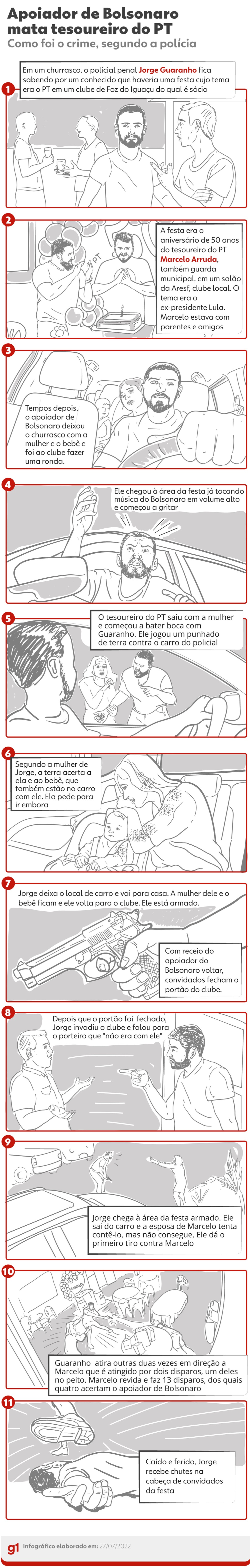 Segundo a polícia, em 9 de julho de 2022, Jorge Guaranho invadiu a festa de aniversário de Marcelo Arruda e os dois discutiram.