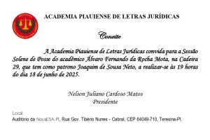 O advogado Álvaro Fernando Mota toma posse nesta quarta-feira (18) na Academia Piauiense de Letras Jurídicas – APLJ. Ele será o primeiro ocupante da cadeira de número 29, cujo patrono Joaquim de Sousa Neto, piauiense nascido em Piracuruca, mas que fez carreira como juiz primeiro no Rio de Janeiro, nos anos 1950, depois em Brasília, onde chegou ao cargo de desembargador e foi presidente do Tribunal de Justiça do Distrito Federal e Territórios.