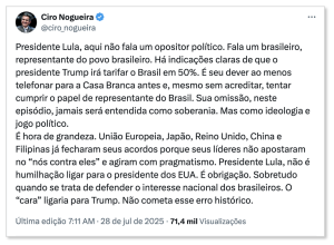 “Presidente Lula, não é humilhação ligar para o presidente dos EUA. É obrigação. Sobretudo quando se trata de defender o interesse nacional dos brasileiros”, declarou Ciro no X.