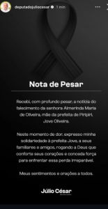 O deputado federal Júlio César (PSD) divulgou nota de pesar pela morte da mãe da prefeita de Piripiri.