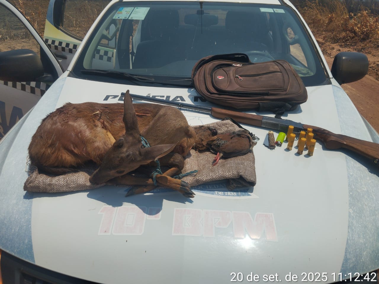 “Os policiais observaram um homem em atitude suspeita se desfazendo de um saco de estopa. Ao se aproximarem, o indivíduo conseguiu fugir. No local, a equipe encontrou um veado abatido, duas aves conhecidas como lambu, além de uma espingarda calibre 20 com sete cartuchos intactos, um isqueiro e um canivete”, desta a PM-PI.