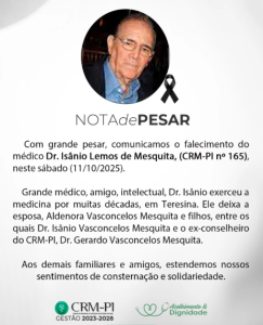 A Universidade Estadual do Piauí (UESPI) manifesta profundo pesar pelo falecimento do Doutor Isanio Lemos de Mesquita, pai dos docentes da Facime, Dr. Isanio Vasconcelos Mesquita e Dr Geraldo Vasconcelos.