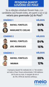 Pesquisa do Instituto Quaest, realizada em todo o Piauí, aponta que o governador Rafael Fonteles (PT) seria reeleito hoje com ampla maioria de votos contra todos os nomes que aparecem como possíveis candidatos ao Governo do Estado no ano que vem. A votação de Rafael varia de 84% a 88% dos votos válidos, dependendo do adversário.
