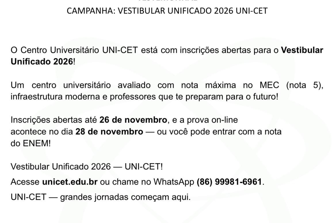 InícioDestaquesVestibular Unificado 2016 UNI-CET DestaquesEducação Vestibular Unificado 2016 UNI-CET Por admin outubro 30, 2025 0 88 Compartilhar FacebookXPinterestWhatsApp https://newspiaui.com/wp-content/uploads/2025/10/1-3.mp4 Comentários Compartilhar FacebookXPinterestWhatsApp Notícia anteriorMédicos iniciam paralisação geral na saúde do PiauíPróxima notíciaVídeo: helicóptero da Polícia Civil presta homenagem a agentes mortos em megaoperação no RJ adminhttps://newspiaui.comPIAUÍ NO NOSSO CORAÇÃO! VEJA TAMBÉM Justiça Itinerante inicia atendimentos na Alepi março 9, 2026 Deputados articulam pedido de impeachment contra Alexandre de Moraes março 9, 2026 Irã confirma que novo líder supremo foi ferido por ataques dos EUA e de Israel março 9, 2026 - CET - - PROCAMPUS - MAIS POPULARES Justiça Itinerante inicia atendimentos na Alepi março 9, 2026 Esposa de Moraes diz que fez 94 reuniões com o Banco Master março 9, 2026 Corpo é encontrado carbonizado e com marcas de tiros em José de Freitas março 9, 2026 Confira as vagas de emprego no Piauí nesta segunda-feira março 9, 2026 Carregar mais