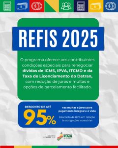 O Governo do Piauí, por meio da Secretaria da Fazenda (Sefaz), disponibiliza, nesta segunda-feira (10), o Programa de Recuperação de Créditos Tributários (Refis 2025), que prevê redução de até 95% de juros e multas para que os contribuintes possam negociar dívidas de ICMS, IPVA, ITCMD e da Taxa de Licenciamento do Detran. O prazo final para negociação desses débitos é até o próximo dia 15 de dezembro.