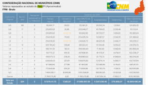 O 2º decêndio do mês de novembro em todo Brasíl, do Fundo de Participação dos Municípios (FPM), é de R$ 1.746.859.981,49, já descontada a retenção do Fundo de Manutenção e Desenvolvimento da Educação Básica e de Valorização dos Profissionais da Educação (Fundeb). Em valores brutos, incluindo o Fundeb, o montante é de R$ 2.183.574.976,86.