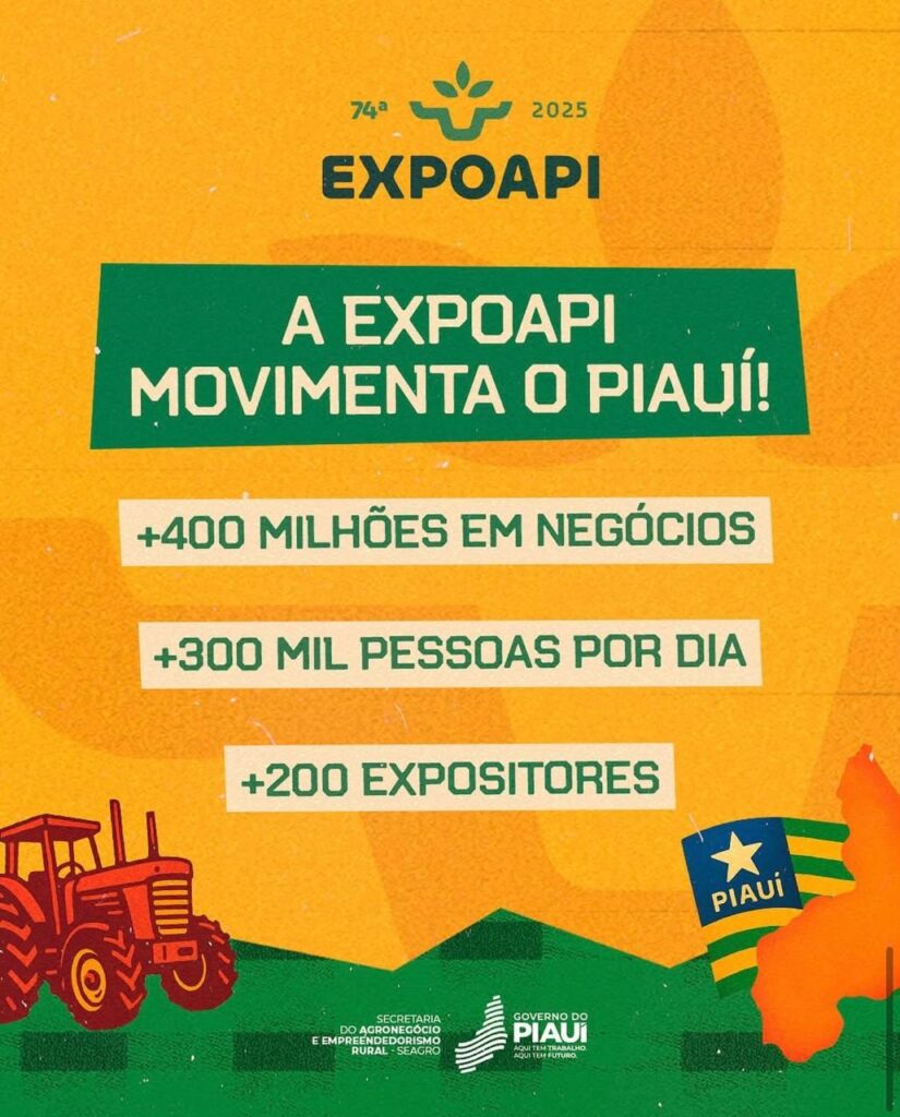 A Expoapi 2025 é realizada pelo Governo do Piauí, por meio da Secretaria do Agronegócio e Empreendedorismo Rural (Seagro), e reforça sua importância como vitrine do setor agropecuário, unindo negócios, tradição cultural e entretenimento.