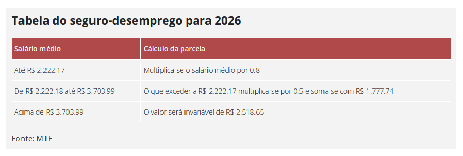 A tabela anual com as regras para o cálculo do seguro-desemprego foi atualizada pelo Ministério do Trabalho e Emprego (MTE). Em 2026, os trabalhadores que têm direito ao benefício vão receber, no mínimo, R$ 1.621.