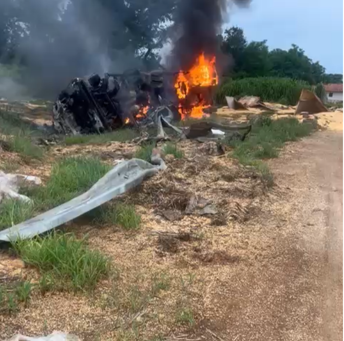 De acordo com informações de testemunhas, o motorista da carreta perdeu o controle na curva, colidindo frontalmente com o carro de passeio, sendo que com a força do impacto causou um incêndio que atingiu os veículos.