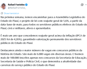 “É mais um ano que concedemos reajuste geral acima da inflação (IPCA de 2025 foi de 4,26%), garantindo valorização permanente dos servidores públicos do Estado do Piauí”, explica.