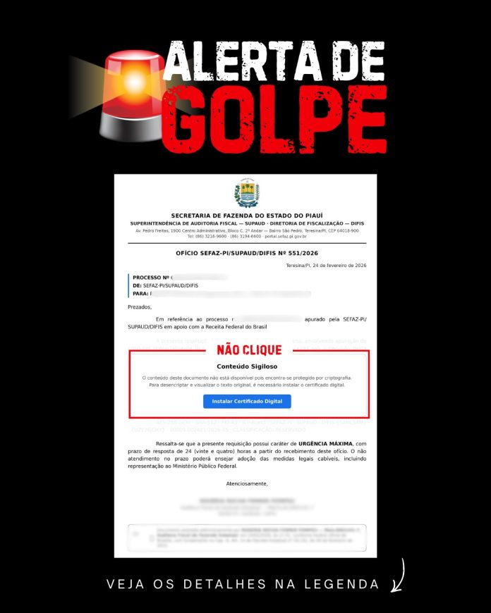 A Secretaria de Estado da Fazenda do Piauí (SEFAZ-PI) alerta a todos os contribuintes e a sociedade em geral que não emitiu ofício ou comunicado via e-mail, ou por meio de outro canal de comunicação (WhatsApp, SMS), objetivando realizar auditoria ou qualquer tipo de apuração fiscal, com conteúdo sigiloso.
